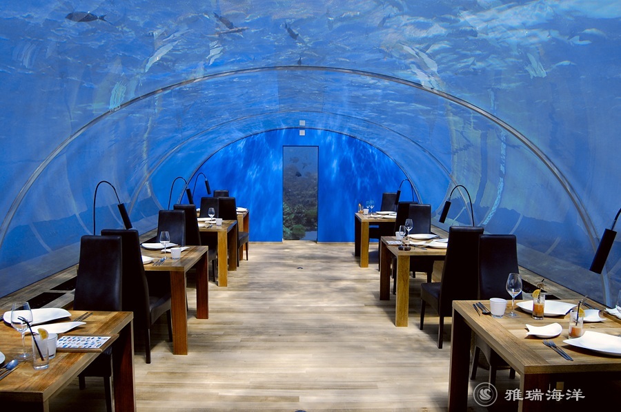 在馬爾代夫康拉德的Ranlifinolhu島上,有一個(gè)不用潛水就可以觀(guān)看水下世界的去處,這就是全世界第一家全玻璃海底水下餐廳“Ithaa”。“Ithaa”在當(dāng)?shù)卣Z(yǔ)意思為“珍珠”,客人沿著一個(gè)旋轉(zhuǎn)扶梯可以走到16英尺的海面之下,沿途一路都是讓人流連忘返的水下風(fēng)景。餐廳位于海平面以下6 米,長(zhǎng)9米、寬5米,可容納14人同時(shí)就餐,外層為透明丙烯有機(jī)玻璃屋頂,它的燈光能輻射到周?chē)?80度的水域,通過(guò)弧形屋頂可以欣賞到270度海底景色。