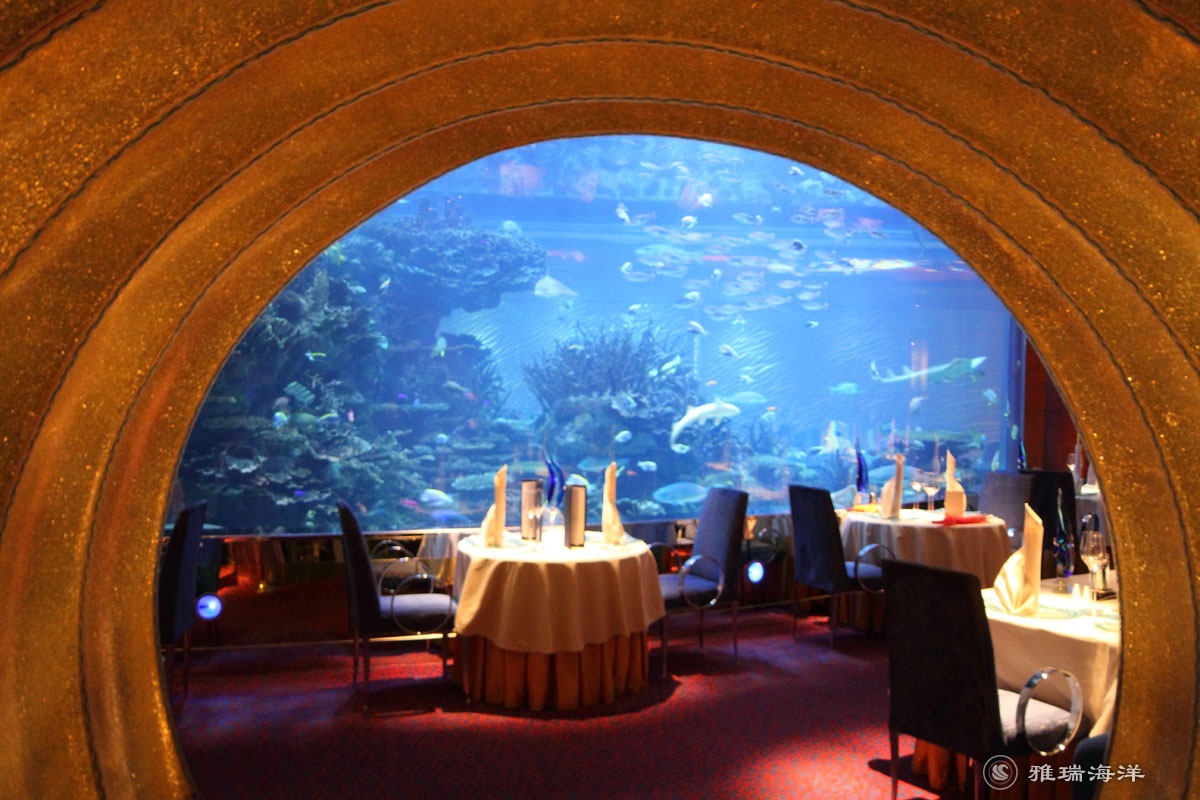 餐廳內(nèi)以海洋生物作布置設(shè)計(jì),有水母型餐椅、海星頂燈、珊瑚燈飾及各種海草型鐵花圍柵,還有環(huán)氧樹(shù)脂粘合層地板讓你如履沙層,甚至連菜單也強(qiáng)調(diào)其水下生活主題。在這里,隔著4英寸的厚玻璃窗,看著魚(yú)兒們游來(lái)游去,飲著頂級(jí)紅酒,吃著龍蝦海鮮,享受著深海美食大餐的情調(diào),如置身于夢(mèng)境之中!